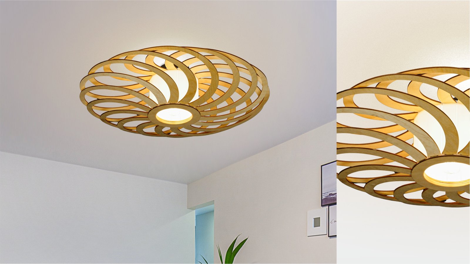 A unique lamp assembly resembling a portal. Due to its flat shape, this lamp is suitable for both spacious and smaller rooms.